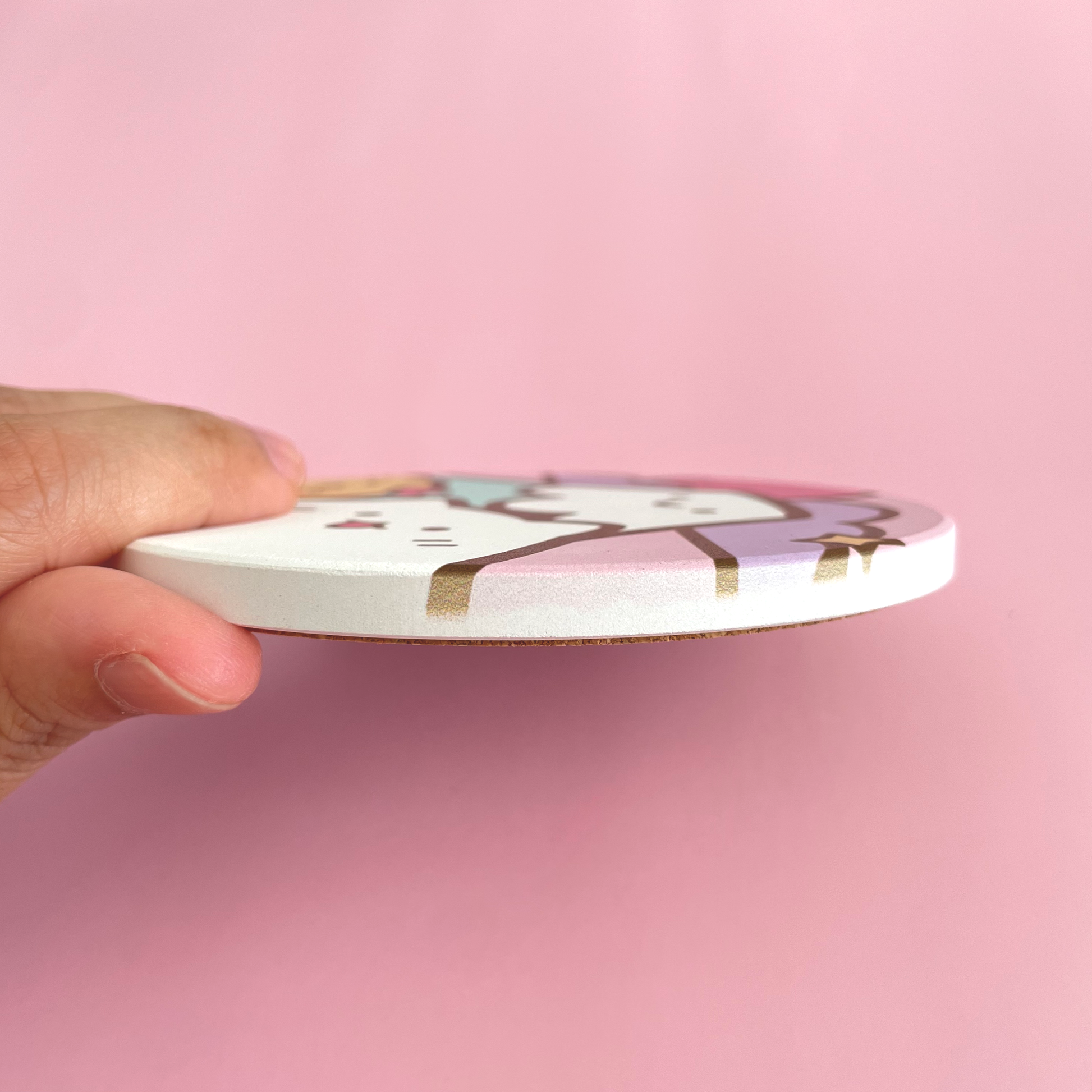 - Water absorbent ceramic coaster with cork base